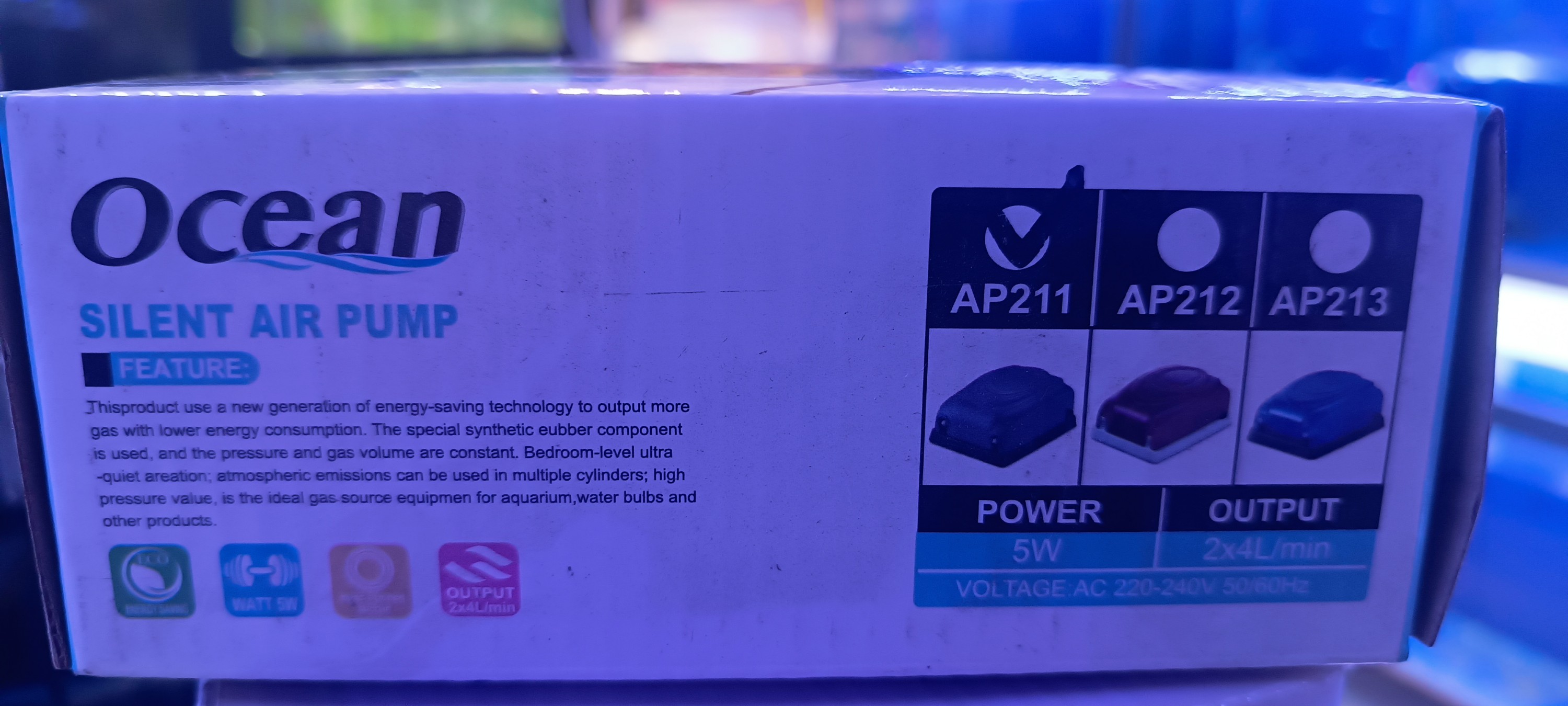 مناسب برای آکواریوم های آب شور، آب شیرین و گیاهیدارای دو خروجی از جنس پلاستیک مقاومدارای دکمه کم و زیاد جهت کنترل فشار هوای خروجیگردش هوا : تا 2*4 لیتر در دقیقهتوان مصرفی : 5 وات