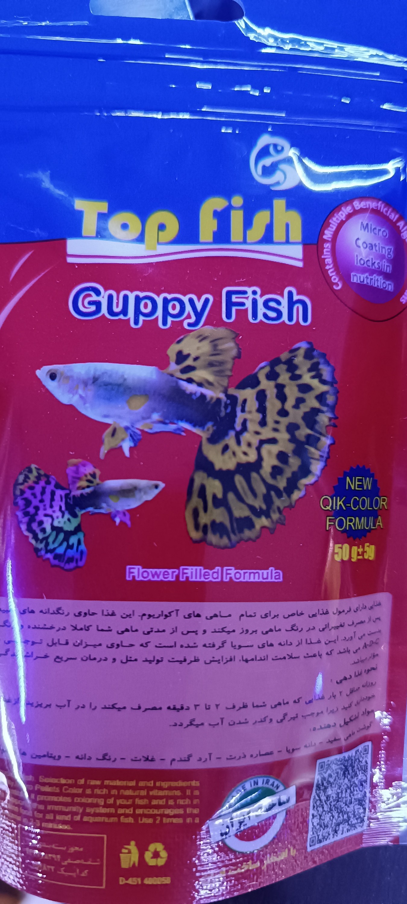 غذا ی دارای فرمول غذایی خاص برای تمام ماهی های آکواریوماین غذا حاوی رنگدانه های طبیعی استکه پس از مصرف تغییراتی در رنگ ماهی بروز میکندو پس از مدتی ماهی شما کاملا درخشنده و رنگ طبیعی خود را به دست می آورداین غذا از رنگ داهای سویا گرفته شده است که حاوی میزان قابل توجهی ویتامین های آی دی و سی استکه باعث سلامت اندام ها افزایش تولید مثل و درمان سریع خراشیدگی های پو.ستی موثر است روزانه حداقل سه بار غذایی که ماهی شما ظرف دو تا سه دقیقه مصرف میکند را در آب بریزیدمواد تشکیل دهنده گوشت ماهی سفید دانه سویال عصاره ذرت آرد گندم غلات رنگدانه ویتامین ها و مواد معدنی